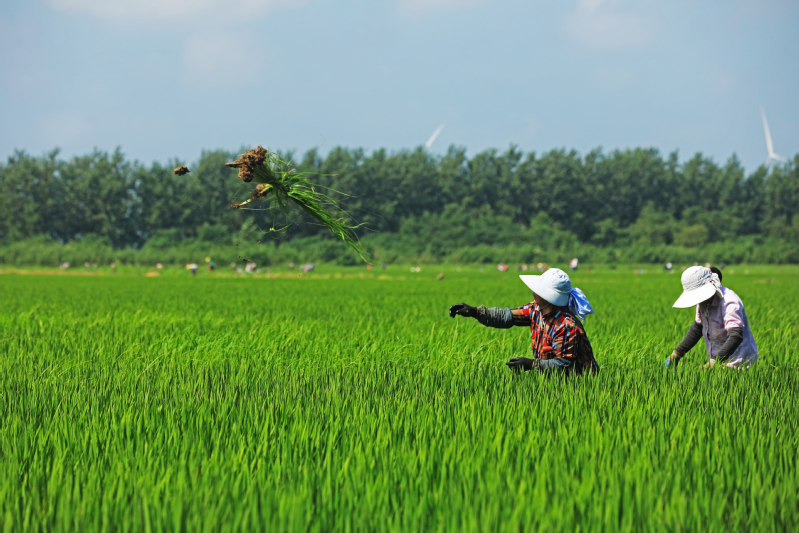 蘇墾農(nóng)發(fā)寶應(yīng)湖分公司擁有3500畝有機(jī)稻生產(chǎn)基地,該基地于2021年取得歐盟、國(guó)環(huán)雙認(rèn)證。為保障有機(jī)稻質(zhì)量,每到夏季,公司都會(huì)組織進(jìn)行人工拔“雜草稻”。高溫炙烤下,200多名勞動(dòng)者揮汗如雨,為生產(chǎn)出“魚(yú)米之鄉(xiāng)”高質(zhì)量有機(jī)米貢獻(xiàn)力量。