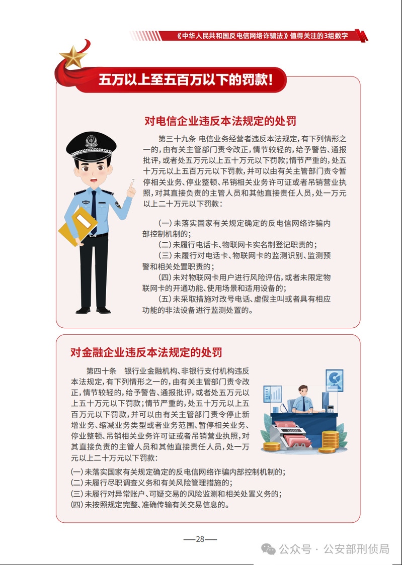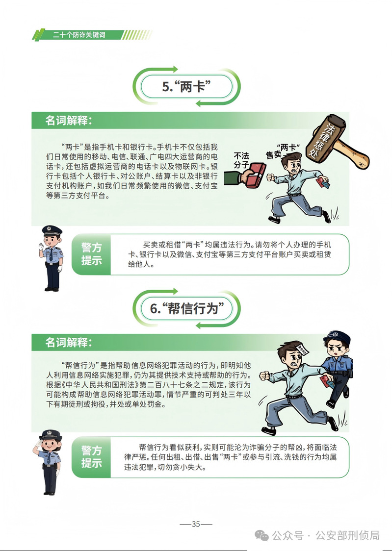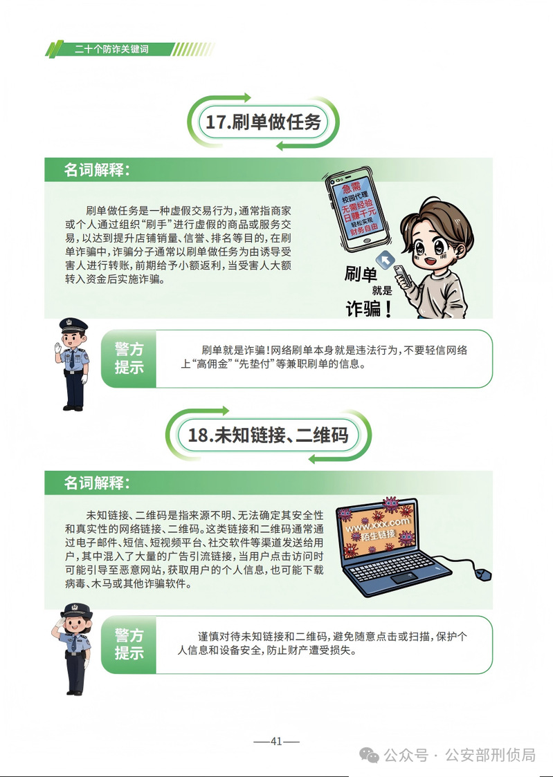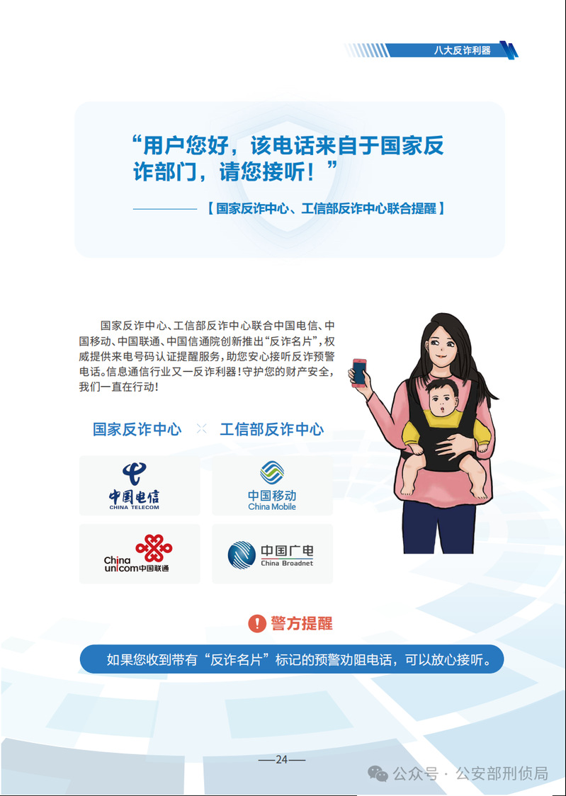 《手冊》詳細梳理了刷單返利、虛假網絡投資理財、虛假購物服務、冒充電商物流客服、貸款征信、冒充領導熟人、冒充公檢法、婚戀交友、網絡游戲產品虛假交易、機票退改簽等10類高發的電信網絡詐騙類型,通過典型案例剖析,逐個解析詐騙套路,揭批作案手法,為易受騙群體“量身定制”反詐防騙提示。同時,《手冊》詳細介紹了前期公安部會同工信部、中國人民銀行推出的七大反詐利器——國家反詐中心APP、96110預警勸阻專線、12381涉詐預警勸阻短信系統、全國移動電話卡“一證通查”、全國互聯網賬號“一證通查”、反詐名片、云閃付APP“一鍵查卡”,以及今年工信部推出的第八個反詐利器——跨境提醒服務,幫助群眾有效甄別境外來電。此外,《手冊》首次總結提煉了幫助群眾快速破譯騙局的20個防詐關鍵詞,切實構筑攔截電信網絡詐騙的“防火墻”。