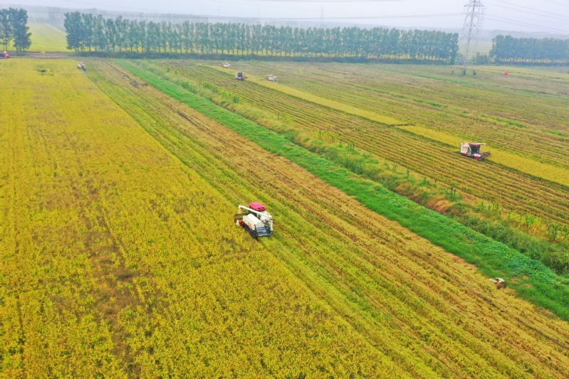 2025年10月10日,蘇墾農發崗埠分公司正在搶收水稻。秋收時節,天氣復雜多變,給秋收工作帶來一定困難,崗埠分公司按照“成熟一塊、收獲一塊”的原則,組織200多臺收運機械,集中力量加緊進行機械搶收作業,確保成熟玉米、水稻等秋糧及時歸倉。